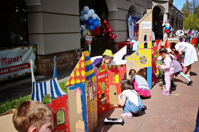 Многих увлекло рисование на картонном городке, создавали который и учили деток 9 мая Анастасия Липатова, Дарья Шарычева и Екатерина Прохожаева (Творческая мастерская «Артишок»).