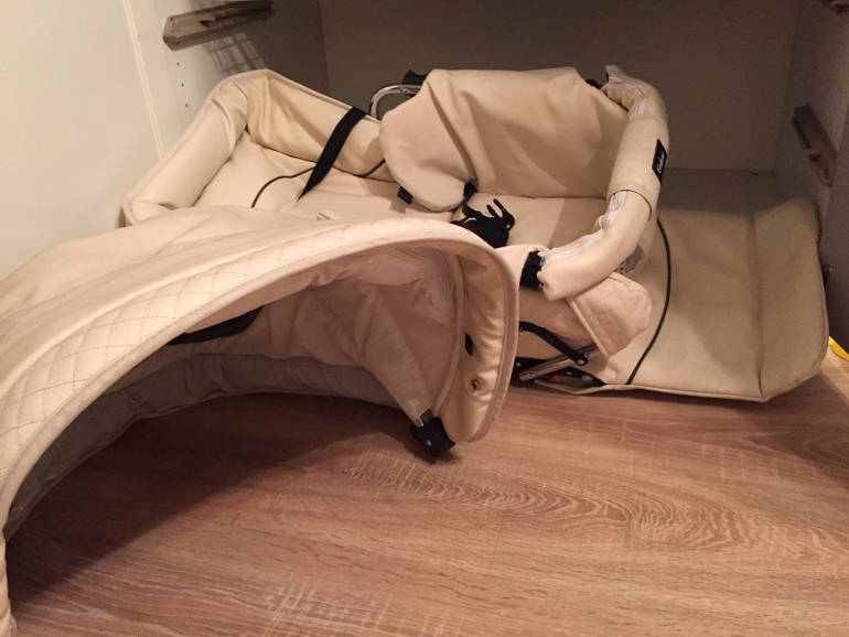 Привет) Если не в сборе — могу отдельно покрупнее пофоткать. Детали распиханы по шкафам))Трещин, пятен нет. Есть небольшой равномерный "загар", но это из области придирок. По цвету коляска именно ваниль, просто неудачное освещение, пришлось со вспышкой снимать. Комплект весь в наличии, кроме текстильного чехольчика к дождевику, честно говоря так и не поняли, куда он делся. Сам дождевик в наличии, но т к коляска кожаная — вполне можно и без него гулять, ничего с ней не произойдет.Москитка и тент от солнца спрятаны внутри капюшона, они пришиты и скручены компактно в кармашек под молнией. Т е они оба в наличии, вроде они не снимаются даже никак)Также из того что нет на фото есть ручки на карабинах, по бокам люльки металлические петли, вот к ним цепляются ручки. Могу сфоткать. Бонусом отдам крючки для сумки JuJuBe, на ручке с двух сторон пристегнуты. По всем вопросам обращайтесь)