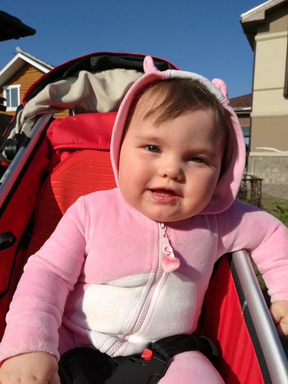 Похудел мой кабачок 11.400 весит..рост 78'5см. Конечно так гонять по дому. Как метеор. Везде встает..везде лезет, за ручку ходит. Показывает "привет"( ручку вверх), белку ( прыгает), машину( бррр), и обезьяну( ручками вверх , вниз машет) ежика делает , но не тогда когда просишь , а сама когда захочет, играет в ладушки, листает книжки, играет в догоню...и в прятки( ходит вокруг дивана ищет Леру) . Ночью уже полностью спит в своей кроватке, в соседней комнате. , ночью грудь не даю, даю кефир. Днем спит на улице в коляске ( надо покатать что бы уснула) ,а вечером..хорошо.. покупалась легла ,выпила кефир на бочок повернулась и спит. Не надо не петь не качать. Днем почему то это не прокатывает. Каждое утро и в обед когда покушает какает в горшок. Вечером голопопит..когда не посади ..всегда пописает.. .а еще любит если написает все сидеть размазывать..утром как то сидела на горшке делала свои грязные делишки, а я жалюзи открывала..отвлеклась на минутку..ну она и поползла по своим делам..с горшка...вся в какашках..и по полу все размазала..)) если Лера плачет..она плачет за компанию...или если та уходит в другую комнату..то сразу за ней...как хвостик. Боится чужих. 28 числа будут крестины..не знаю как все пройдет..наверное с криком. Она очень сообразительная...растегивает все молнии на себе, все разбирает , все кнопки нажимает, соску на бутылке откручивает, у стула барного ручку открутила,.инженером точно будет. Кушает..тттт.хорошо. хлеб ооочень любит..даже сытая..кричит что бы.дали..
