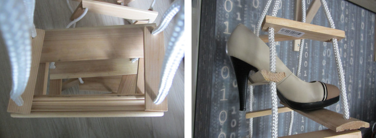 Надеваем деревяшки на шнур таким образом, чтобы отрезки равной длины были параллельны друг другу, но перпендикулярны отрезкам другой длины. Сначала 2 коротких, затем, перпендикулярно, 2 длинных: плинтус и наличник, затем, перпендикулярно, 2 коротких наличника и т. д. Плинтус нанизываем так, как он ориентируется при креплении его в обычном его использовании. В зависимости от высоты каблука размещаем перекладины относительно друг-друга.