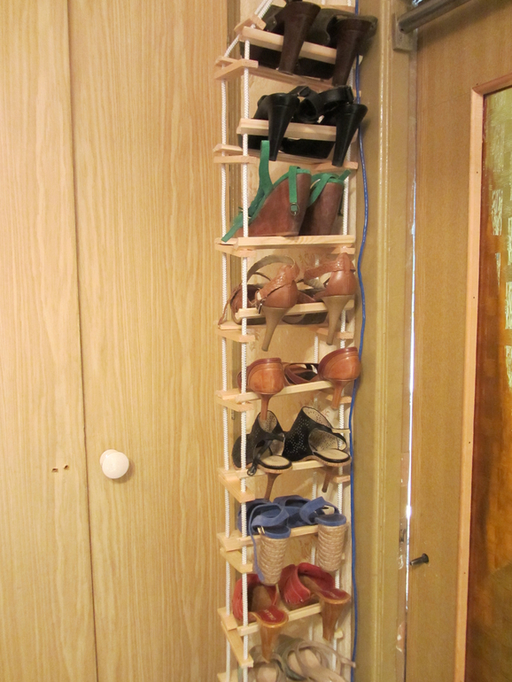 Концы шнура завязываем. Подвешиваем повыше на стену. Загружаем обувь. Обувь ставится так, чтобы каблук зацеплялся за плинтус.