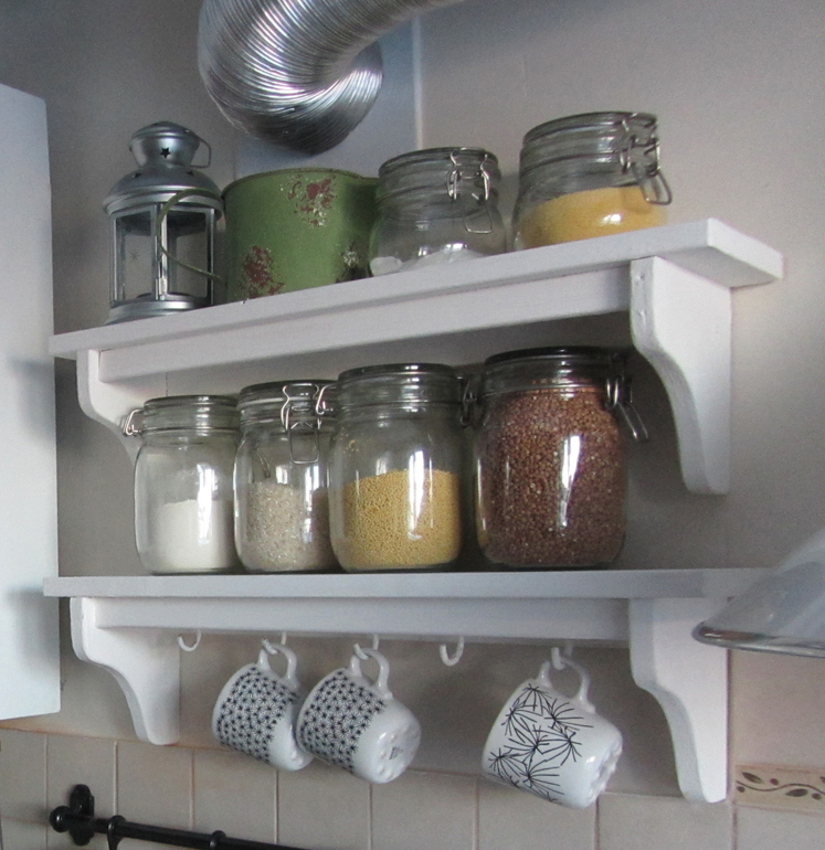 Провести линию по дну полки вдоль ее длины. По этой линии с одинаковыми интервалами разметить и прикрутить 5 штук крючков. Покрасить полку, после высыхания повесить на стену. Разместить предметы, отвечающие двум условиям: 1. раньше поставить их было некуда, 2. они помещаются на эту полку по внешним габаритам.