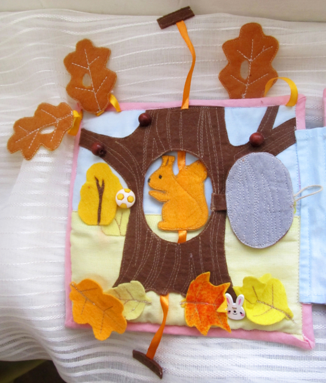 Дуб с листочками, которые одеваются на пуговицы-желуди. Можно снять и устроить листопад. В опавших листьях прячется зайка. А в дупле прячется белочка, которую дергая за ленточку можно прятать глубоко в дупло.