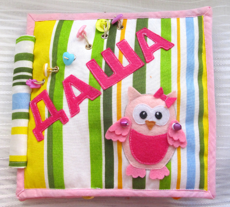 Обложка с совушкой, махающей крыльями с бубуенцами и "дергательными" пуговками.