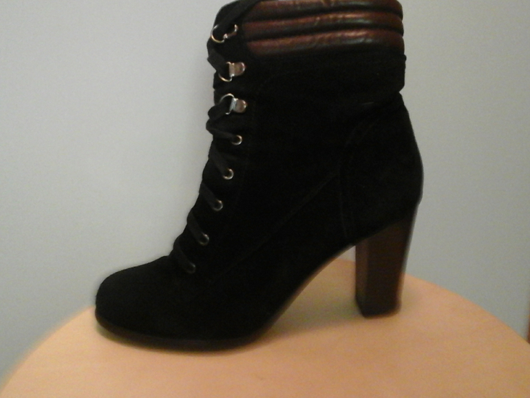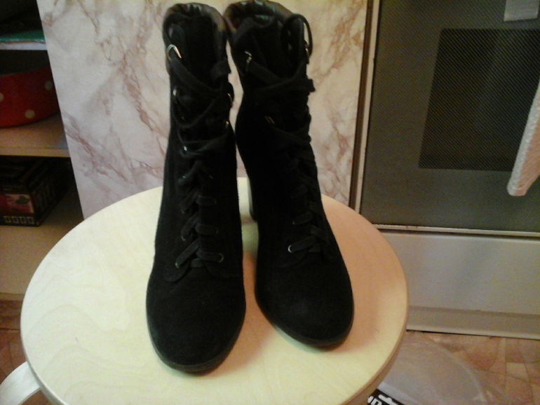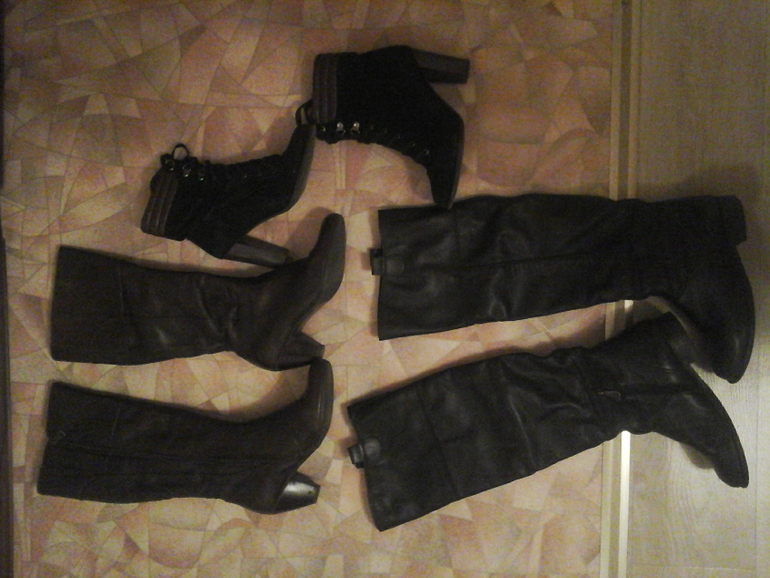 ботильоны замшевые черны, сапоги на каблуке маленьком коричневые, сапоги ботфорты на каблуке черные. Все в хорошем состоянии