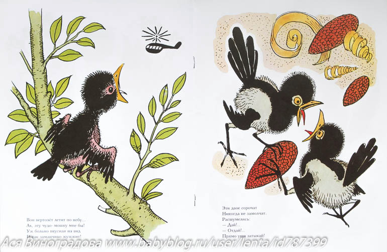 Вообще, всю эту серию отличает искристое чувство юмора, понятное малышам. «Пальцем в небо» не исключение. Стихи коротенькие, много абсурдной чепухи, в которой мы с Кирюхой уже и сами поднаторели. Проще говоря: с детства учите детей искусству обращения с языком, образному мышлению, жонглирования словами и легкому взгляду на вещи. Это дает гарантию «нескучания» ближайшие 10-15 лет…=)))