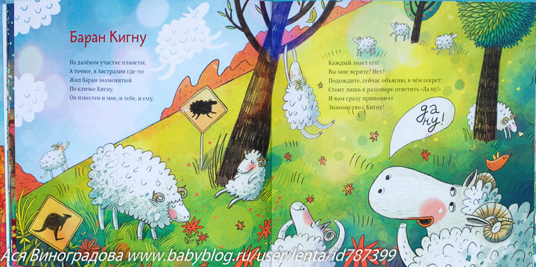 «Баран Кигну», и правда, уникальное издание. Юлии Григорьевой не только удалось создать современнейшие, я бы даже сказала, модные иллюстрации (как по стилю рисунка, так и по цветовой гамме), но и гармонично обрамить ими задорные, хулиганские стихи Натальи Ромашовой. На каждом развороте витиевато переплетаются узоры, градиенты, цветовые переходы, все настолько идеально, что и придраться ни к чему.