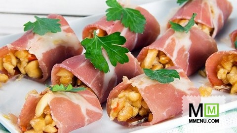 Каких только рецептов рулетов и рулетиков не существует. Но на праздничный новогодний стол хочется приготовить что-то особенное. Например, такие пикантные рулетики из сыровяленого окорока.