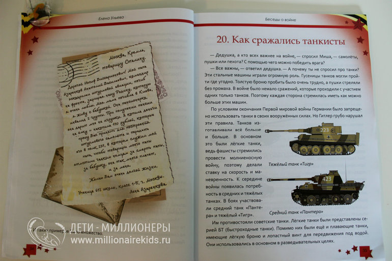 Но если ваши сын или дочь достигли 6 лет или являются школьниками начальных классов, то лучше почитать книгу "Беседы о войне". Присутствие взрослых обязательно, стоит наблюдать за эмоциональным состоянием юного читателя и пояснить непонятные моменты. А их будет немало, даже при том, что текст Елены Ульевой очень доступный для восприятия. Но так сложилось, что новое поколение уже не имеет дедушек и бабушек, которые могут рассказать свои истории, и многие понятия для них новы. Мы подготовили подробный обзор книги, чтобы вы сами могли решить если она подходит для ваших детей.
