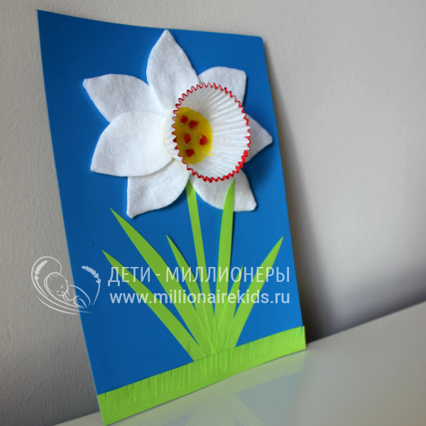 Мы сделали поделку из ватных дисков, заняла она у нас пол вечера, но зато сколько интересного мне удалось рассказать Александру о цветке Нарцисс. Благодаря этой творческой работе, можно провести целое тематическое занятие. Нарциссы - весенние цветы, их пик цветения приходится на май месяц. Делая поделку с ребенком, можно показать картинки других весенних цветов, которые вскоре дитя сам увидит на грядках. А еще лучше рассмотреть луковичку и высадить ее вместе в грунт. Также можно почитать или выучить короткие стихи: