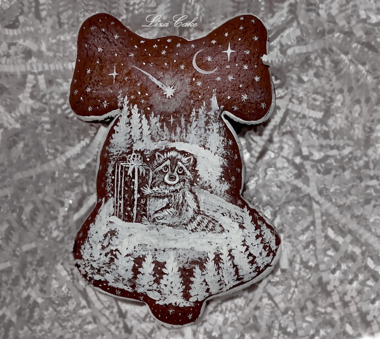 Заранее купленную коробку для торта я в предновогодней суете куда-то подевала и металась по шкафам в поисках оной. Задержка мною человека спешащего на праздник изрядно расшатывала мои нервы, я чувствовала свою вину, отчего ещё более лихорадочно и бестолково искала коробку. Наткнулась на упакованный енотный пряник и чтоб хоть как-то отвлечь человека от мыслей об опаздании, молча протянула его показать [нуу.. ладно.. похвастаться] - типа "смотрите какой пряник в пару к носочкам"..