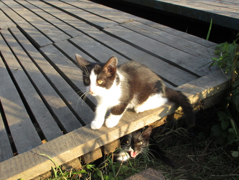 На причале живет кошка с котятами:
