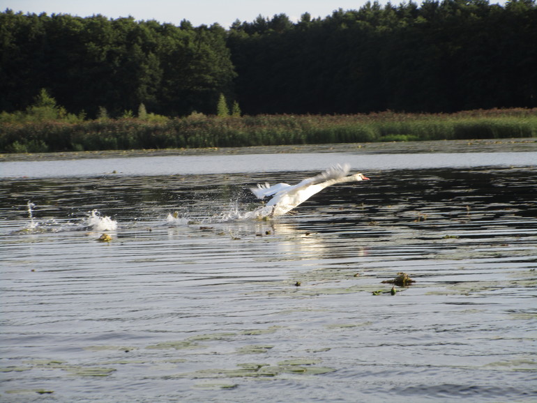 А это дикий лебедь испугался шума нашей моторки: