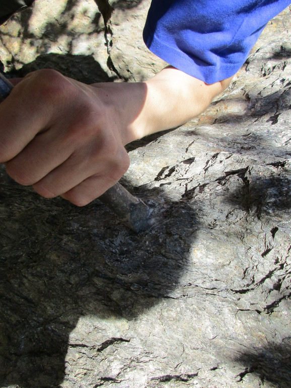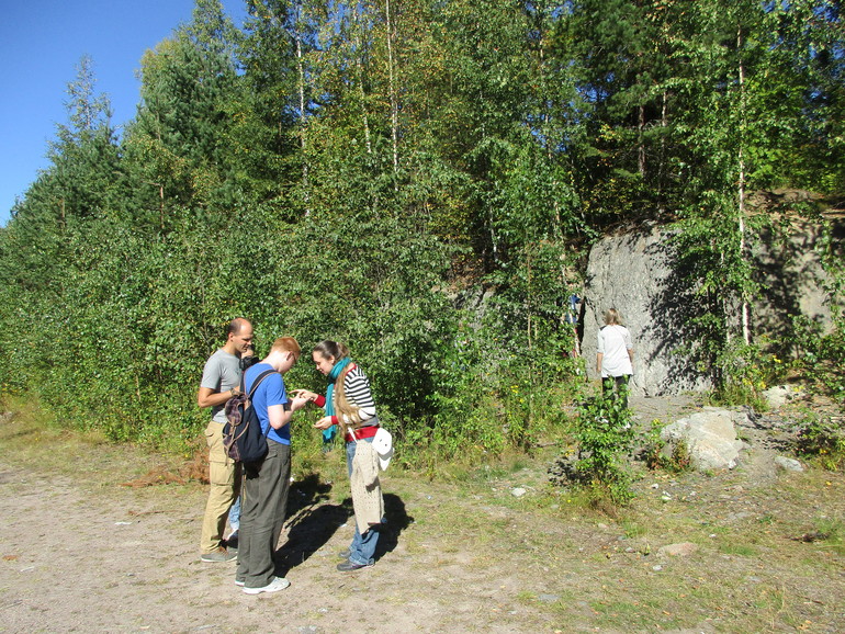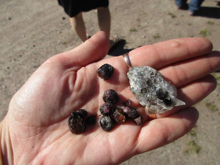 Затем мы отправились добывать из скал полудрагоценный камень гранат-альмандин. Надо было видеть, с каким азартом целая группа взрослых людей бросилась долбить скалы молотками и зубилами!!!