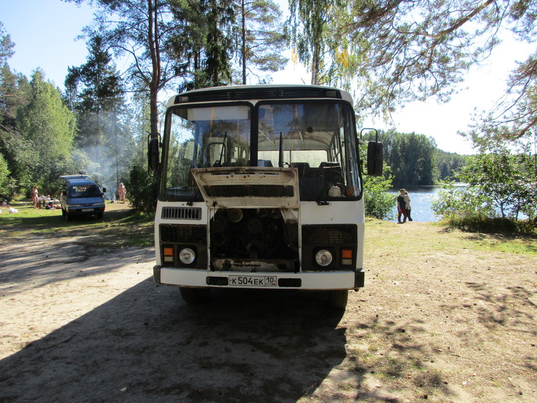Дороги в Карелии - это ЖЕСТЬ! Хорошему большому автобусу там не проехать никакими судьбами, поэтому катались мы на таком вот чуде советского автопрома. До сих пор удивляют 2 вещи: