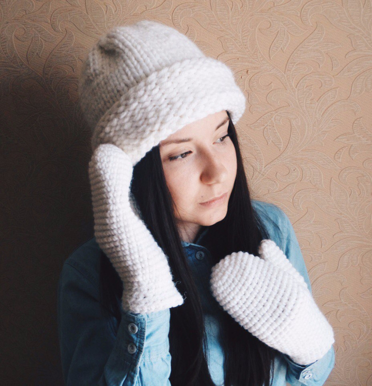 Шапочка кипельно белого цвета, связана на заказ из мягчайшей объемной пряжи, плотная вязка позволит носить даже в самые лютые морозы