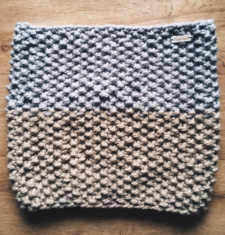 На фото двухцветный снуд в один оборот из объемной пряжи.