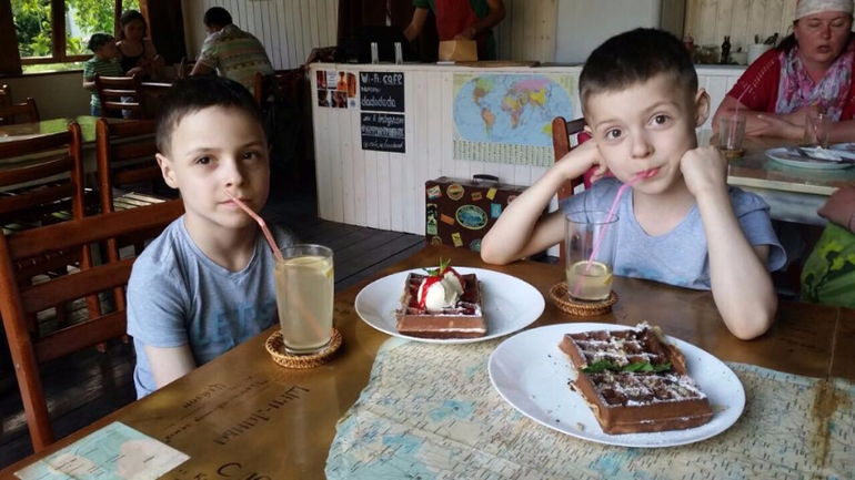 На территории Зеленой усадьбы есть уютное кафе "На чемоданах", где дети лопали венские вафли, а я балдела с кофе и чаем.