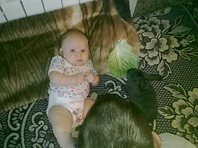 А ещё мы вчера с кроликом познакомились, так и норовила его руками схватить