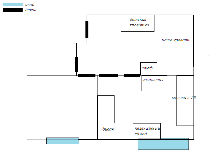 расстановка мебели будет как на картинке (только комп.стол и пеленальник местами поменяем). Ночью будем спать в кроватке в спальне, а днем будем обитать в гостиной.