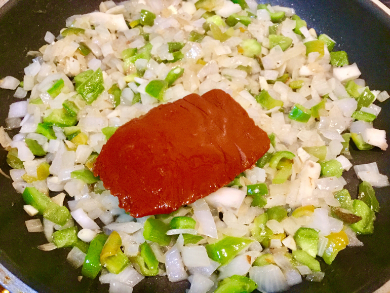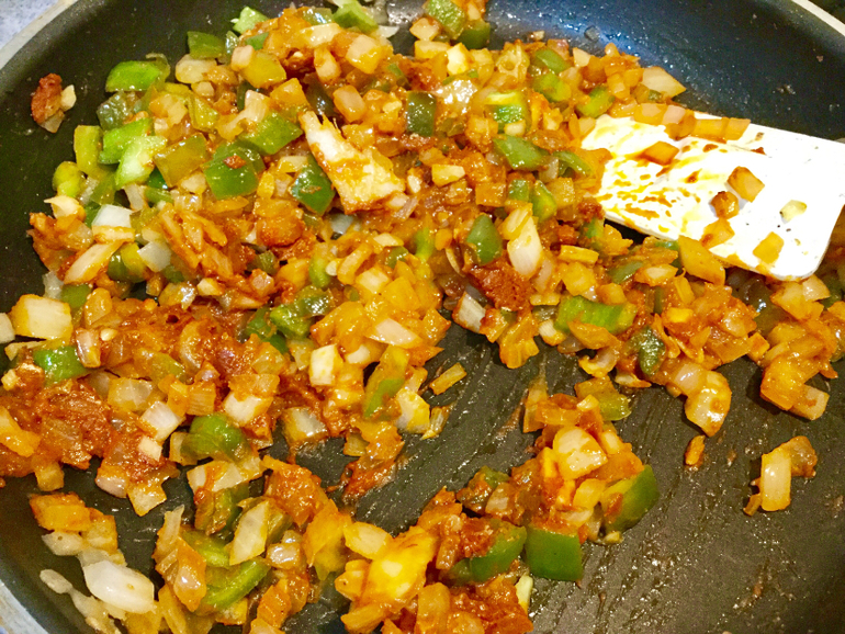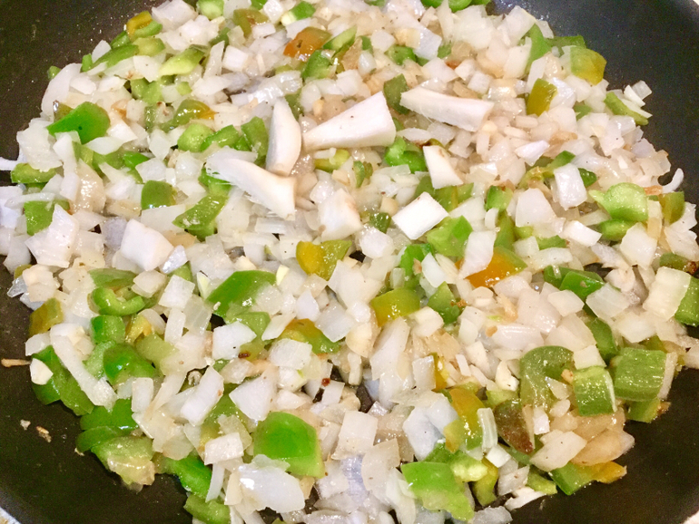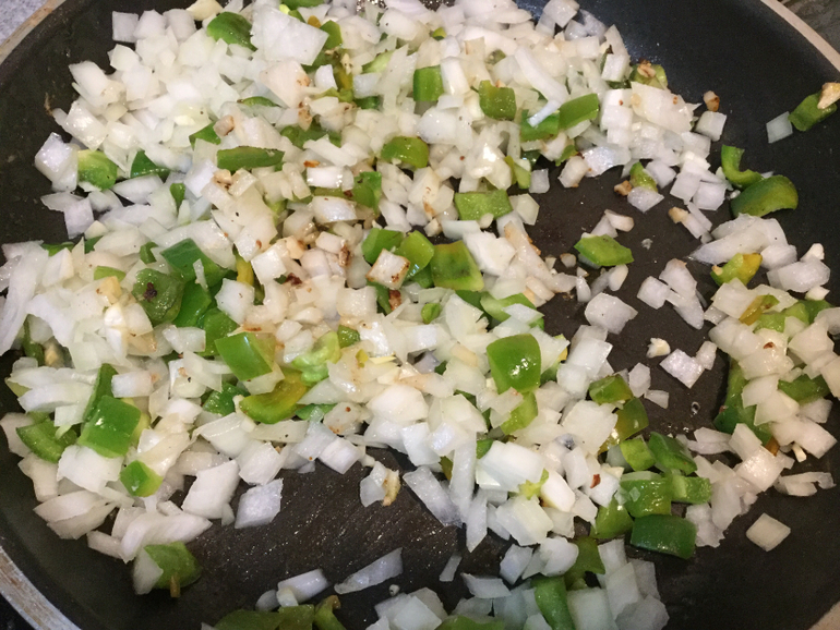 На масле, в котором жарились креветки, обжарить до мягкости мелко порезанный лук, чеснок, перец.