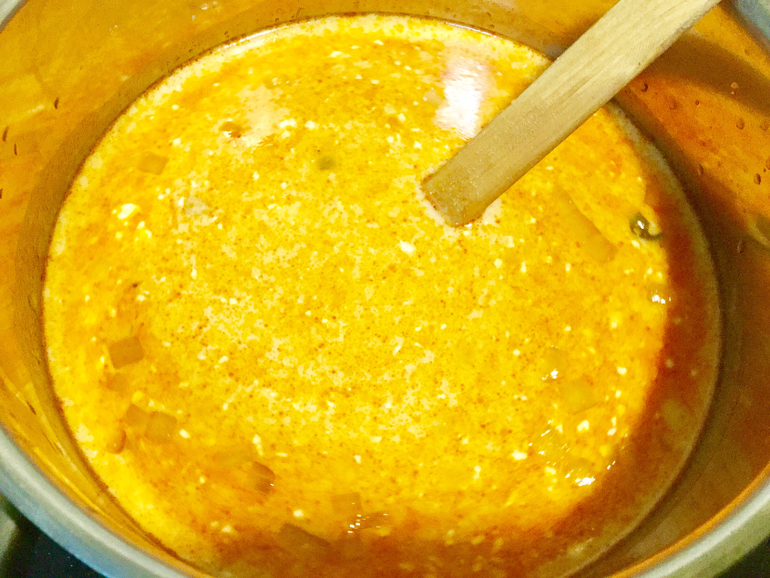 В кастрюлю переложить овощную смесь , влить кокосовое молоко, перемешать. Добавить бульон. Дать покипеть 10 минут, чтоб суп немного загустел.