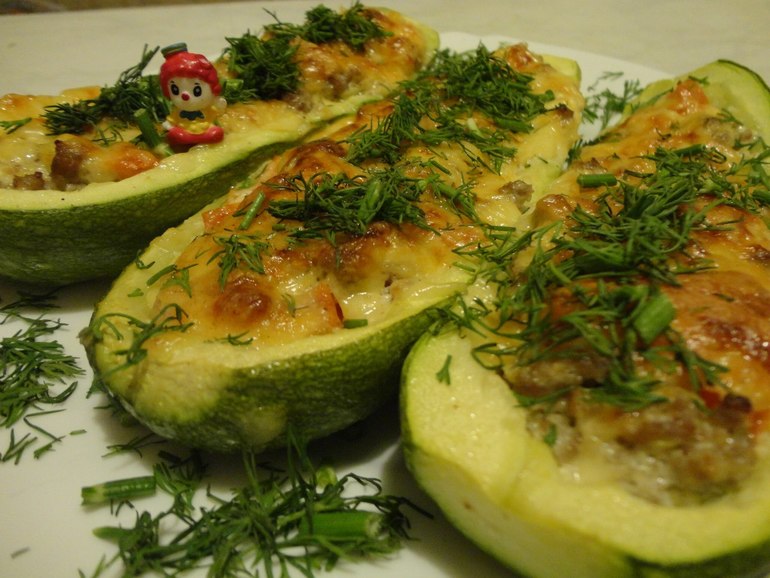 Готовим кабачки фаршированные, запеченные в духовке. Очень вкусные и оригинальные лодочки из кабачков.Простой рецепт фаршированных кабачков.