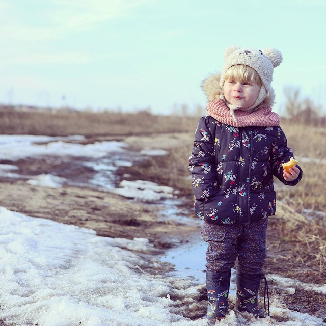 Снег...и лужи! Свинка Пеппа вне конкуренции!!!)) #малыш #дочка #снег #лужи #весна #загород #природа #прыгатьполужам