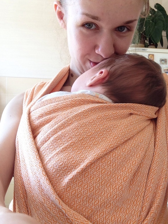 Про слинг еще до родов слышала-видела у знакомых фото-читала о полезности использования. Очень долго выбирала и советовалась, в итоге купила хлопковый слинг-шарф двойного диагонального плетения. Кто не знает, это отрез ткани метров пять длинной и пол метра шириной. Ну, это я так, на глаз. Купила, подержала в руках радостно, открыла видео-урок, покрутила-повертела и отложила подальше, поскольку пришла в ужас от того, как непросто туда лялю завернуть.