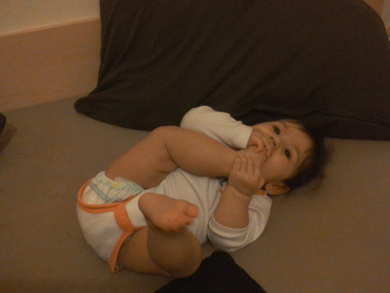 4. Постоянно лепечет, количество звуков и их сочетаний растёт каждый день. Ну она и слышит регулярно три языка, не говоря уже о немецком, который иногда проскальзывает. Поэтому у нас и деде, и да-да, баба, буве, ага, ире, ара, мама, нене, ане, ням, Умба, умбя, дишь... Короче, много. Плюс песни :) с танцами