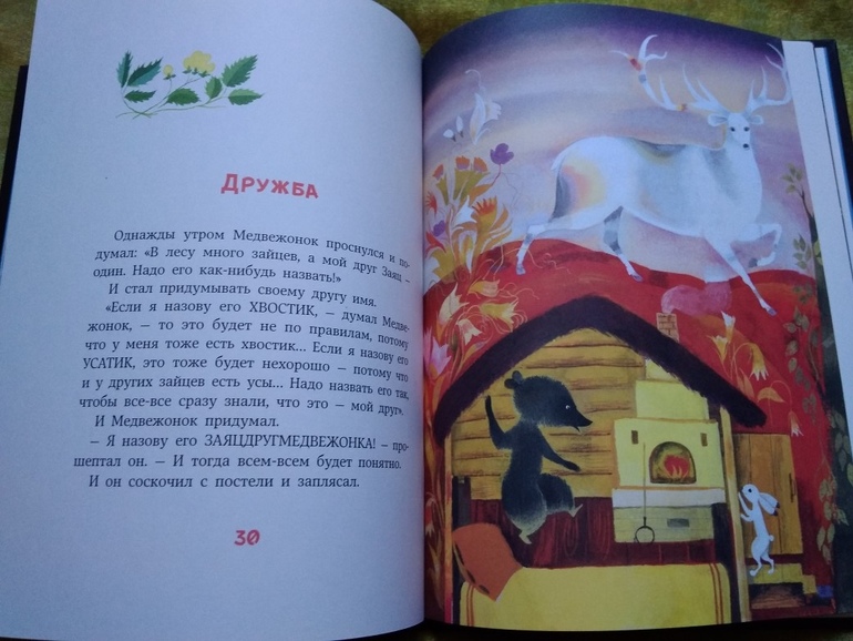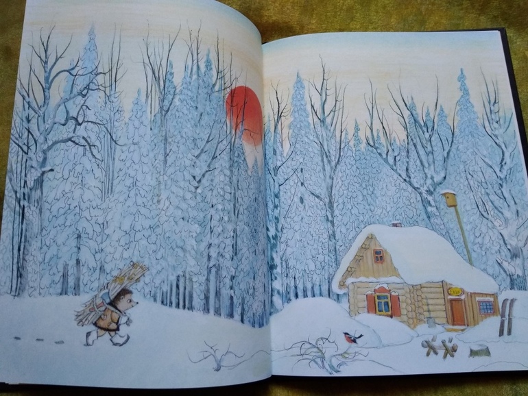 И черное зимнее небо вместе с обложкой совсем не кажутся мрачными - они как фон для ювелирных изделий. Ветвистое снежное дерево на обложке кажется выпуклым и сделанным из серебра. И в лапках у ежика палочка - волшебная или дирижерская? Сейчас он взмахнет ею и раздастся серебряный звон. Это звенят сказки. Это слова в них сталкиваются, соединяясь в волшебные цепочки. Они расскажут нам о лесе, о дружбе, о волшебной музыке полдня, о медовых дождях и морковных деревьях...