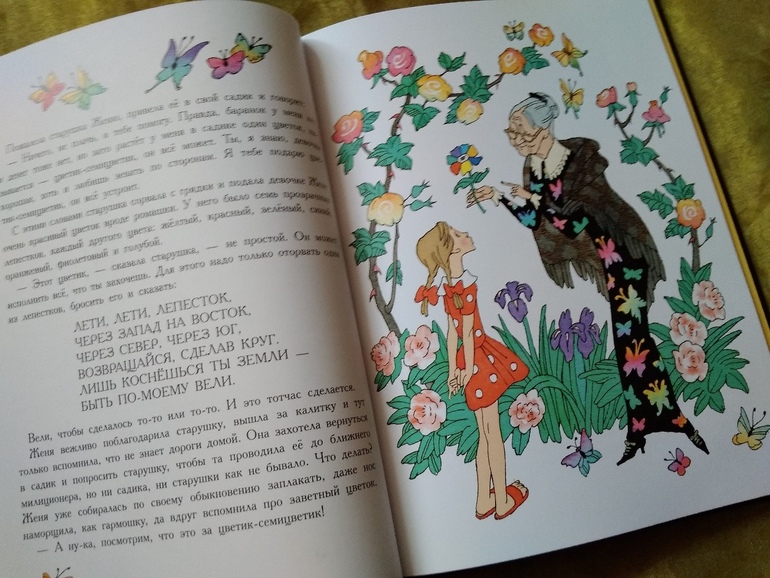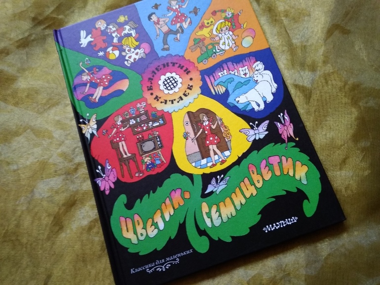 Я уже рассказывала про книгу сказок с иллюстрациями Булатова и Васильева. И о том, что на моих полках в их иллюстрациях, как выяснилось, имеются только стихи. Для исправления сложившейся ситуации у меня появилась еще одна сказка - советская классика, входящая во все хрестоматии и известная каждому русскоговорящему ребенку. Это "Цветик-Семицветик" Валентина Катаева.