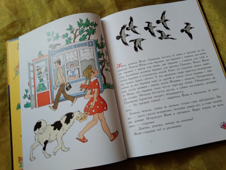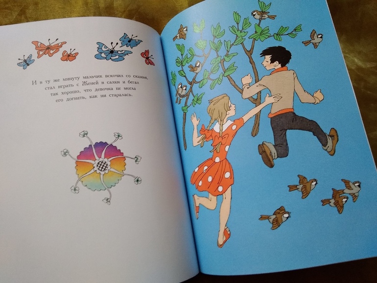 Я когда-то пропустила переиздание с рисунками В.Лосина, взяв как раз перед ним маленькую бюджетную книжечку с иллюстрациями Ольги Рытман. Тогда перевесила не только цена, но и реалистичность ярких иллюстраций, и содержание. Для интимного "камерного" чтения нам хватало, девочки книжку полюбили, да и Тёме она нравилась. Он вообще эту сказку любил. Я старалась детям мультфильм включать пореже - хоть и нарисован он прекрасно, по-диснеевски, но там и в сюжете есть отступления от текста, и лепестки другого цвета, и стихотворение-заклинание звучит иначе. Мне хотелось, чтоб дети запомнили классический хрестоматийный вариант. Но, когда детей больше, чем двое-трое, для коллективного чтения гораздо лучше, если формат у книги будет повнушительней. Как раз как у этой.