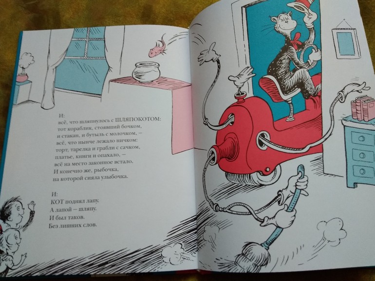 Книга слегка ошарашила размерами... Нет, она не выделяется среди книг большого формата, но я-то ожидала небольшую аккуратненькую книжицу, как наш Слон Хортон из первого тиража, который легко входит в любую сумку или рюкзак. Ну и ладно, зато шрифт крупный и воздуха на страницах - более чем ) Кот - провокатор и подстрекатель больше всего нравится мне тем, что убирает за собой. Все бы так, чтоб не надо было спрашивать: "Был на квартиру налет? К нам заходил бегемот?"