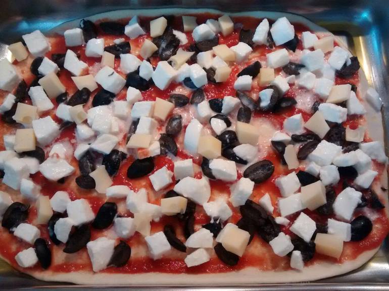 Теперь идёт начинка. Первый слой - томатная паста (ее немного посолить и добавить оливкового масла). Потом мелко нарезанный сыр (+ все что вы хотели добавить)))