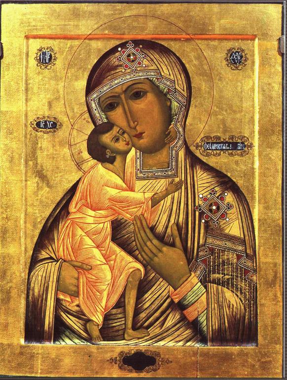 Феодоровская икона Божией Матери. Эта икона издревле особенно почитается на Руси. Она покровительствует не только невестам и семейному благополучию, но и рождению малышей у бездетных пар и воспитанию детей