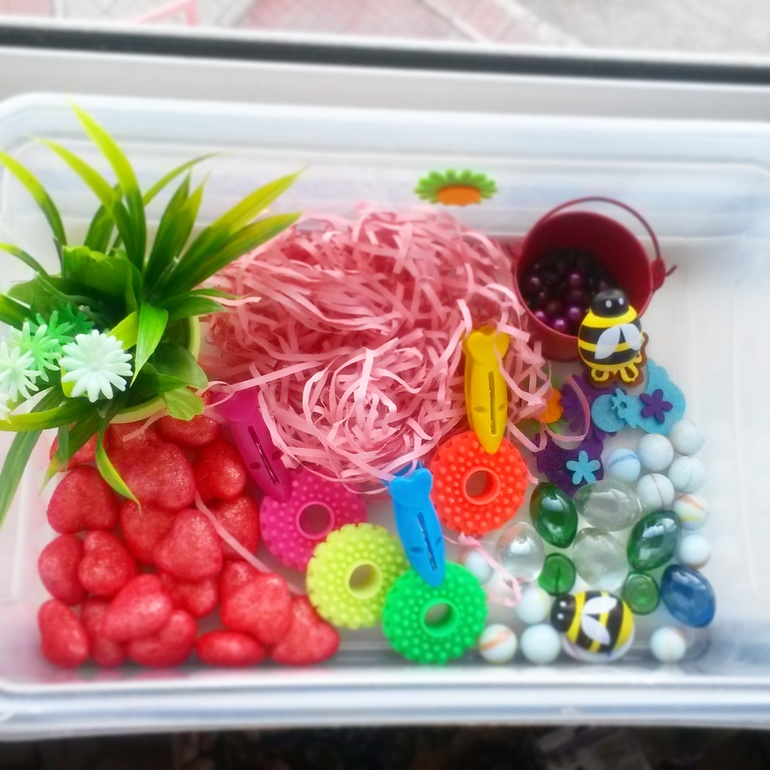 Возьмите большую миску насыпьте в нее много фасоли, пшена или чечевицы, закопайте в глубине мелкие предметы, например маленьких зверушек , подвески от мобильного телефона.