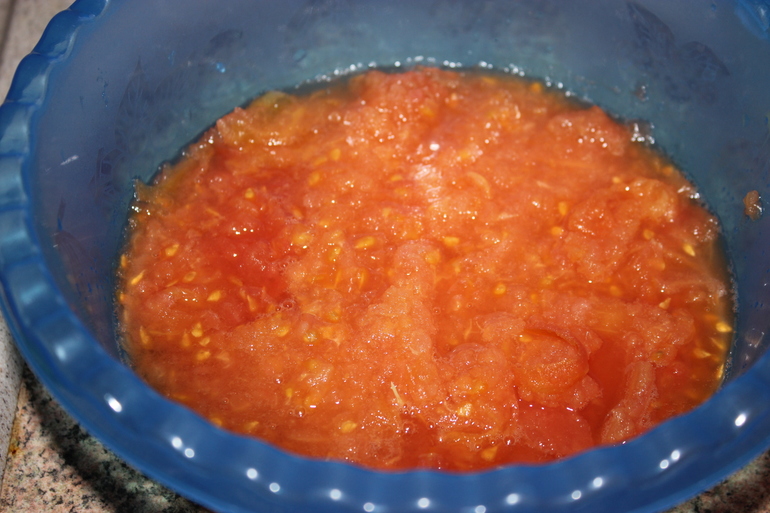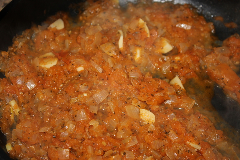 Перемолоть в блендере помидоры , и добавить в лук с чесноком.