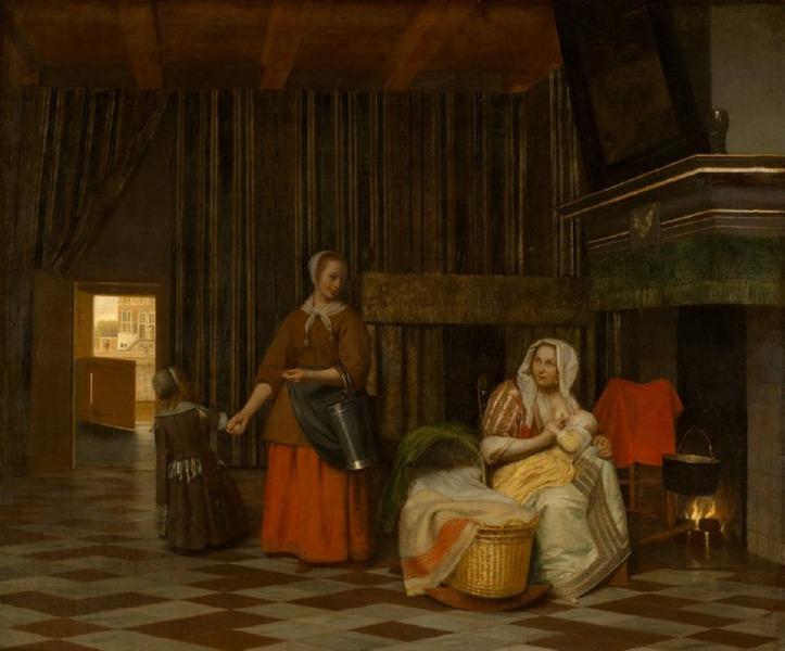 🎨 Картина де Хоха дает понять, что на его полотне изображена молодая мама, которая достаточно обеспеченна, чтобы нанять кормилицу, но она знакома с последними книгами о семейной жизни и воспринимает их как руководство к действию. Возможно, что современники воспринимали картину не только как собственно картинку, но и как скрытый призыв: даже если у вас есть деньги - кормите детей грудью, чтобы вырастить их здоровыми!