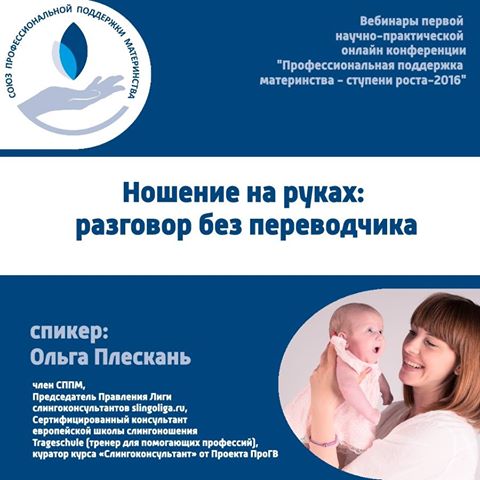 Спикер: Ольга Плескань - член СППМ, Председатель Правления Лиги слингоконсультантов, Cертифицированный консультант европейской школы слингоношения Trageschule (тренер для помогающих профессий), куратор курса «Слингоконсультант» от Проекта ПроГВ.