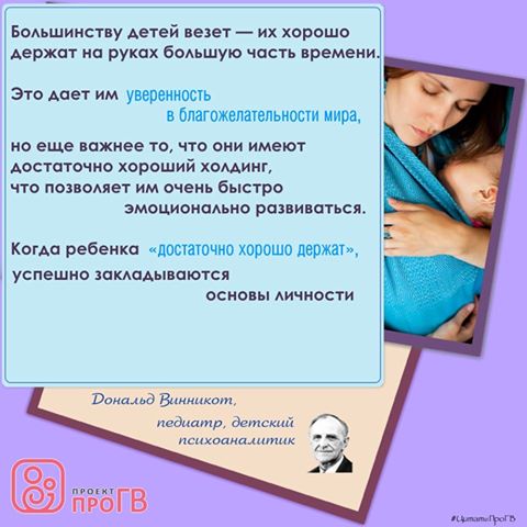 Большинству детей везет - их хорошо держат на руках большую часть времени. Это дает им уверенность в благожелательности мира, но еще важнее то, что они имеют достаточно хороший холдинг, что позволяет им очень быстро эмоционально развиваться. Когда ребенка «достаточно хорошо держат», успешно закладываются основы личности. Дети не помнят о том, что их «держали достаточно хорошо». Травмирующий опыт остается у них в памяти, когда их «не держали достаточно хорошо».