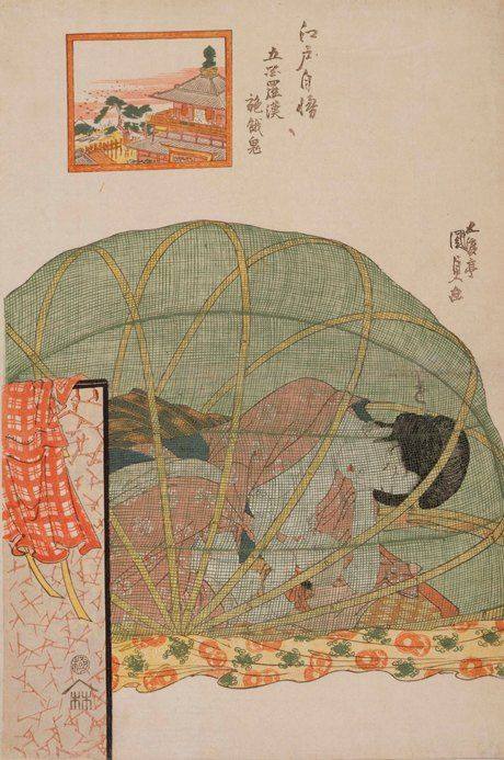 Этому свитку примерно 200 лет. Автор - Утагава Кунисада, японский художник конца эпохи Эдо. Любопытно, что мы видим не просто изображение кормящей матери, но и зашифрованное соотнесение с ежегодными календарными обрядами,. На гравюре на стене комнаты висит картинка с обрядом: это приношение голодным духам в храме, которое соотносится с кормлением грудью.