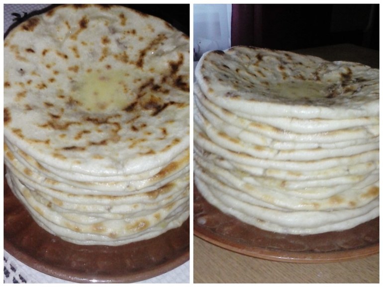 выкладываем хычин и обжариваем с обеих сторон. Хычины пекутся легко и быстро, иногда вздуваются пузырем на сковороде, их нужно просто проколоть. Каждый хычин после выпекания нужно обильно смазать сливочным маслом и сложить в стопочку.