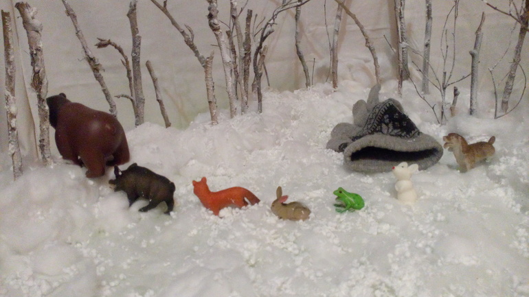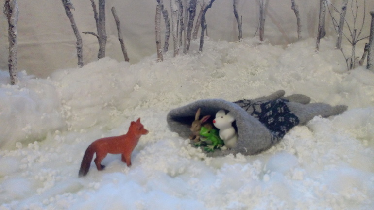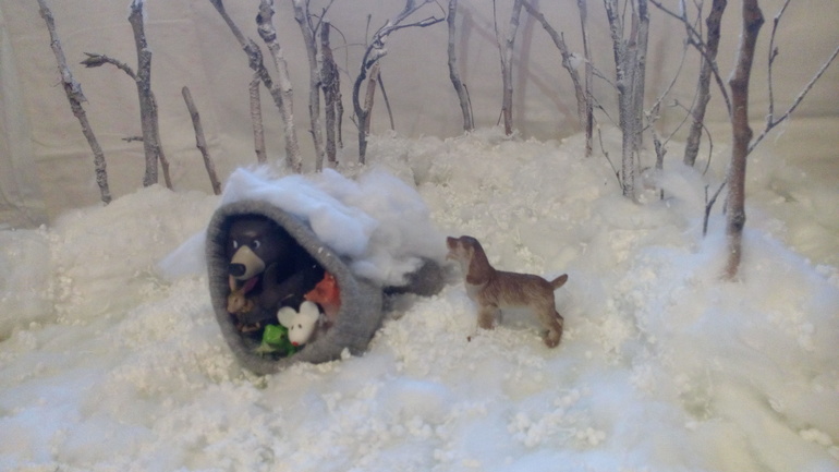 В сказку"Рукавичка" мы играем давно , слава Богу втискиваться мне не куда не приходилось мне была отведена роль деда,а Саша была собачкой ,ну,и не обошлось без игрушек! Недавно я решила сделать декорацию к этой сказке! Правда у нас нет игрушечного деда ,но мы и без него обошлись!И мышка у нас белая,другой не нашлось!Но,что поделаешь! В сказке все возможно!))