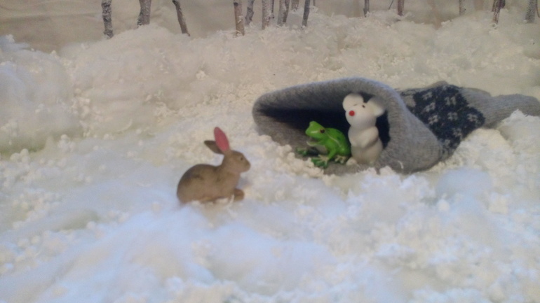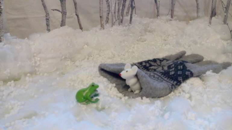 Залезла лягушка к мышке в рукавичку,и стало им обеим тепло и уютно.