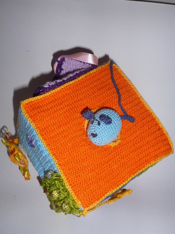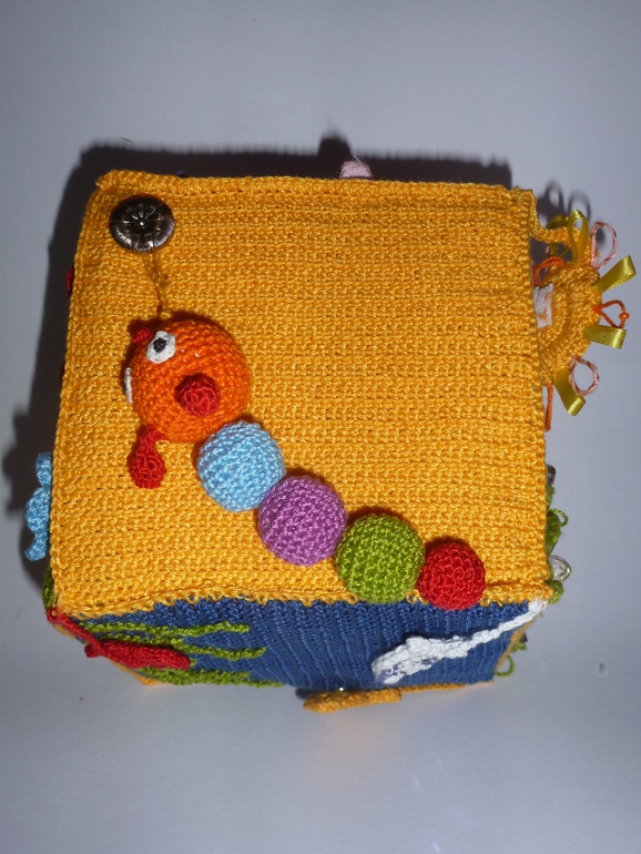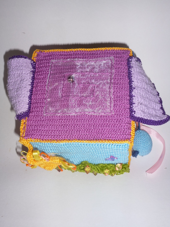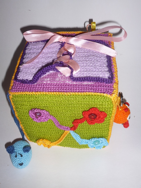 Изучаем цвета, геометрические фигуры, счет до 5. Треугольники квадрат шуршат, круг звенит. Есть прорезыватель. Сам кубик можно использовать как погремушку.