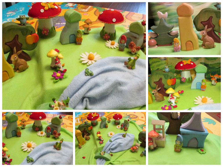Погода за окном не радует, так хочется солнышка и яркой зелени, а вокруг только грязные лужи ((( Вчера перед сном, читая уже полюбившуюся книжку о маленьких гномиках «Дети лесного гнома» Эльзы Бесков, я так замечталась , что пообещала дочке волшебную полянку. Утро началось с фразы «мама, а где же гномики???», сказано - сделано…..)))) Времени на подготовку не было, поэтому полянка мастерилась по принципу «я тебя слепила из того, что было, а потом….» То что получилось дочке понравилось, так что думаю не плохая идея для долгих зимних вечеров.