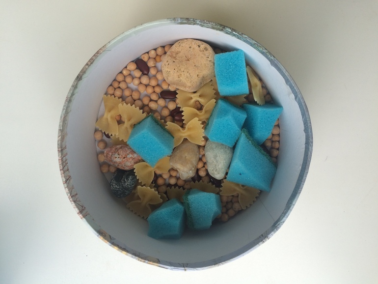 Состав: нут, макароны бантики, камни морские=), губка, фасоль.