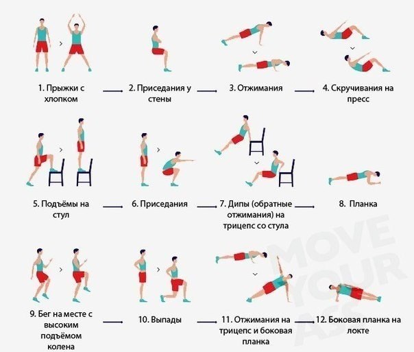 Для того, чтобы данный комплекс упражнений использовать как полноценную интервальную тренировку необходимо выполнить 2-3 круга в течение как минимум 20 минут, при этом интенсивность падать не должна.