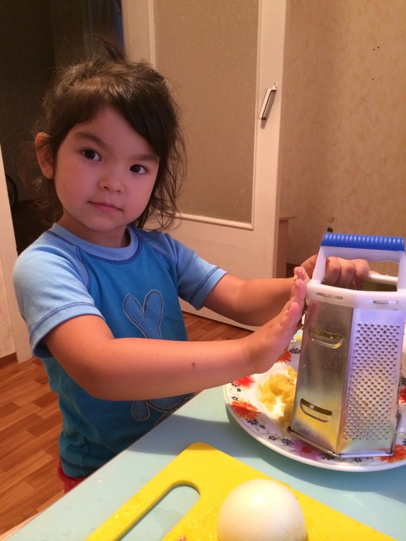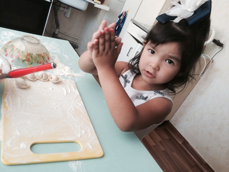 Латиша моя любит выдумывать разные стихи и сочиняет на ходу песни)) помощница по дому за все берется с охотой и любопытством))Так готовим пельмешки))а так трем овощи на салат)